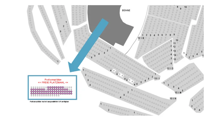 So funktioniert’s!Aus technischen Gründen ist es leider nicht möglich, die Podiumsplätze im ProArte-Webshop auch optisch auf der Bühne zu platzieren. Daher finden Sie die Podiumsplätze unten links in einem separaten Kasten (im Bild unten mit blauem Rahmen dargestellt).